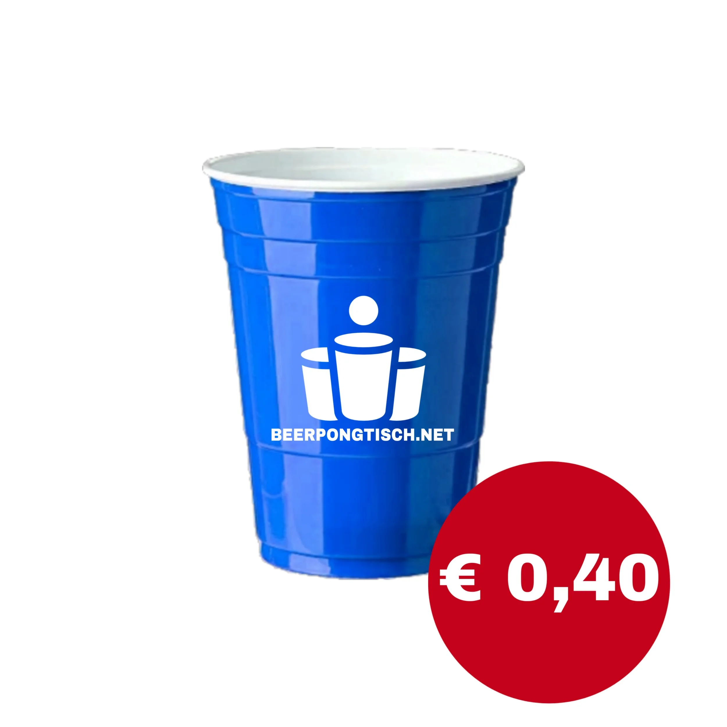 Wiederverwendbare Plastikbecher mit klassischen Beerpong Maßen in kräftigem blau!